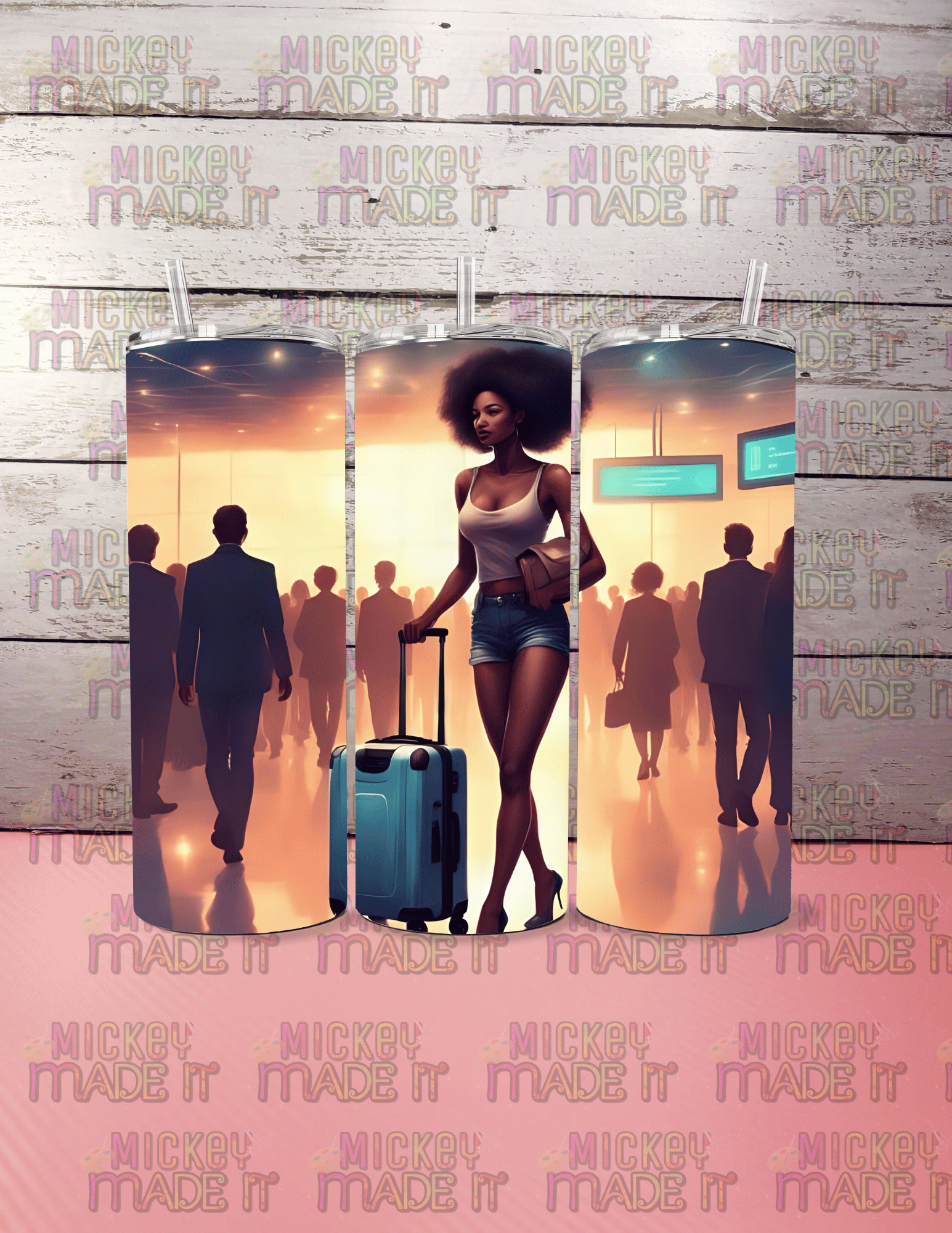 This one’s for the girls who stay booked and busy. The Catch Flights, Not Feelings 20oz tumbler features a stunning design of a stylish Black woman walking confidently through the airport terminal—luggage in hand, future in focus. With double-wall insulation and a sleek stainless steel finish, this travel-ready tumbler keeps your drinks hot or cold through layovers, takeoffs, and everything in between.